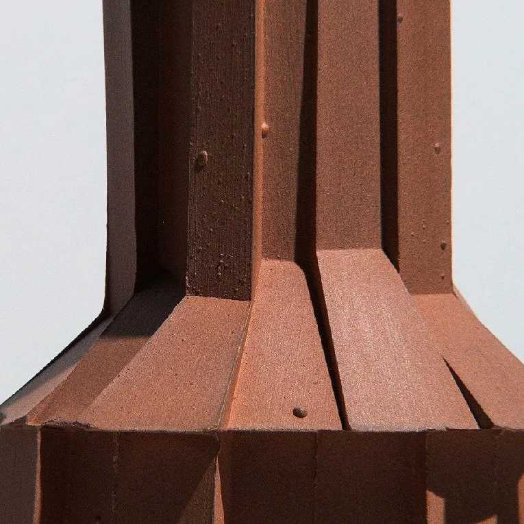 Vase bouteille aux facettes aléatoires résultant d'un coffrage modulaire.